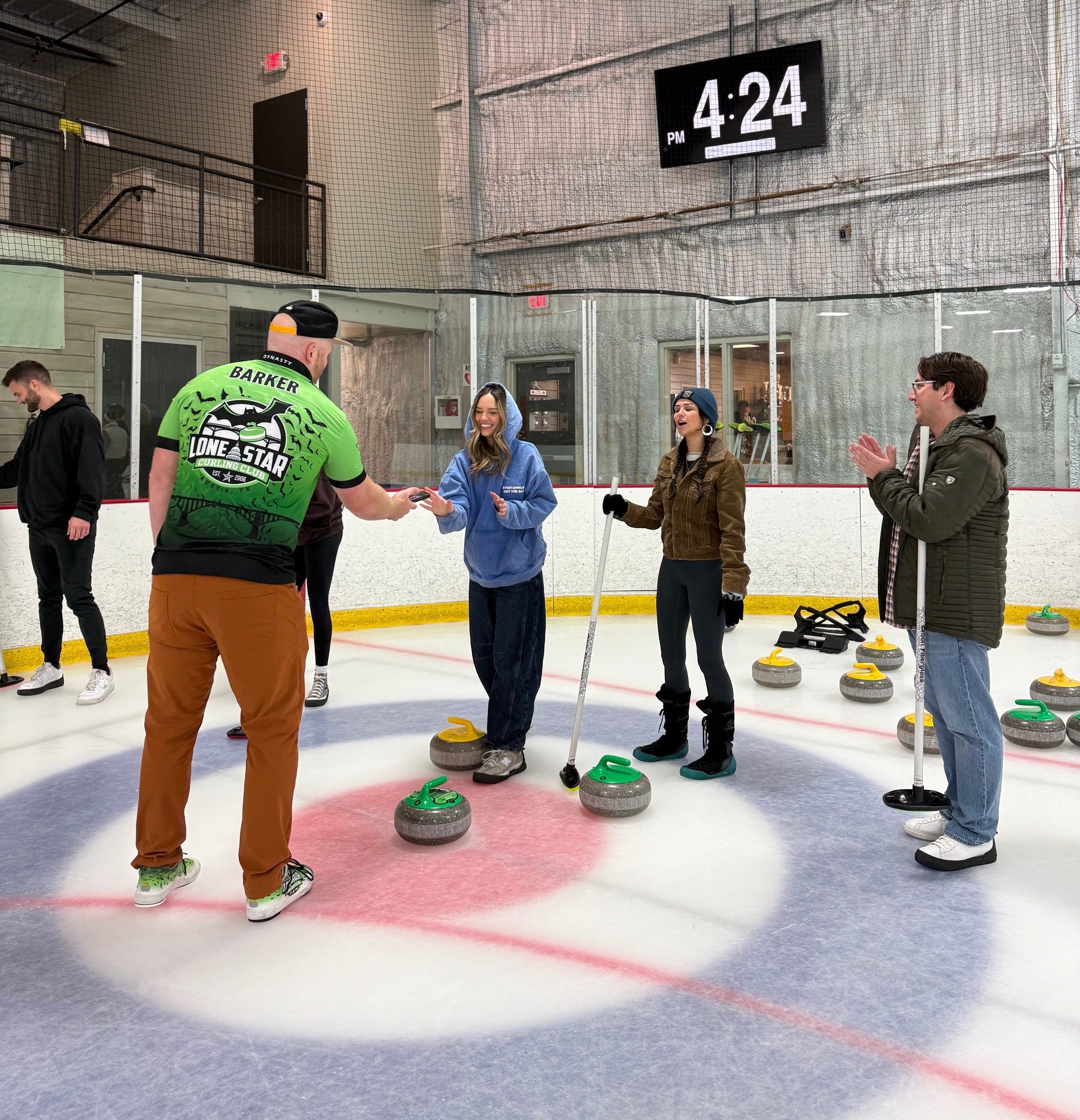 Even so, they had five volunteers step up to lead the Learn to Curl, with another 20+ curlers come to play pickup games in the background to make it look busier for any posted content.